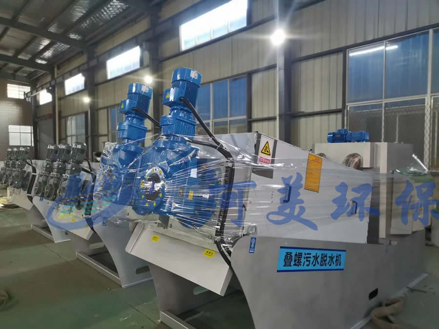 可美環保研制的疊螺式污泥脫水機主要由機架、螺旋軸、動環、靜環、隔環、雙頭螺栓、絮凝攪拌機、電氣控制箱等組成。