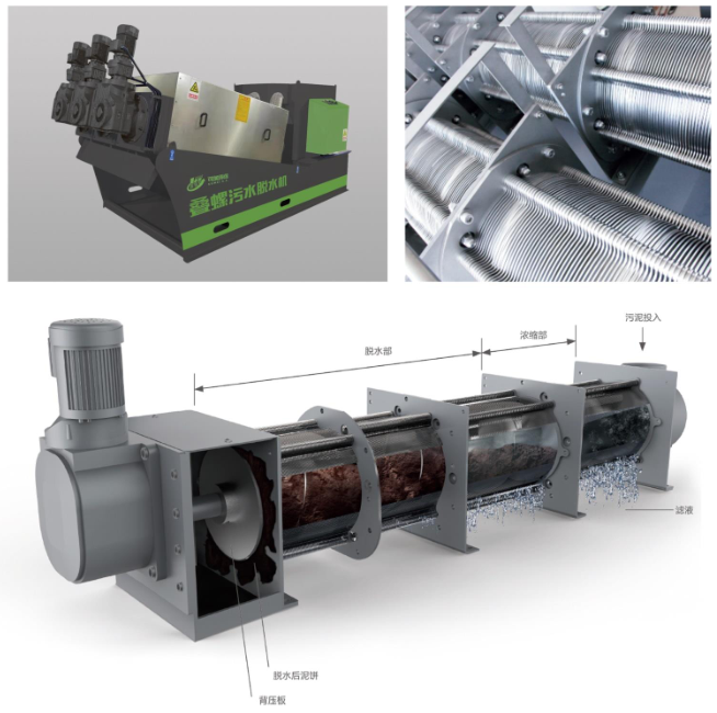 濃縮:當螺旋推動軸轉動時,設在推動軸外圍的多重固活疊片相對移動,在重力作用下,水從相對移動的疊片間隙中濾出,實現快速濃縮。